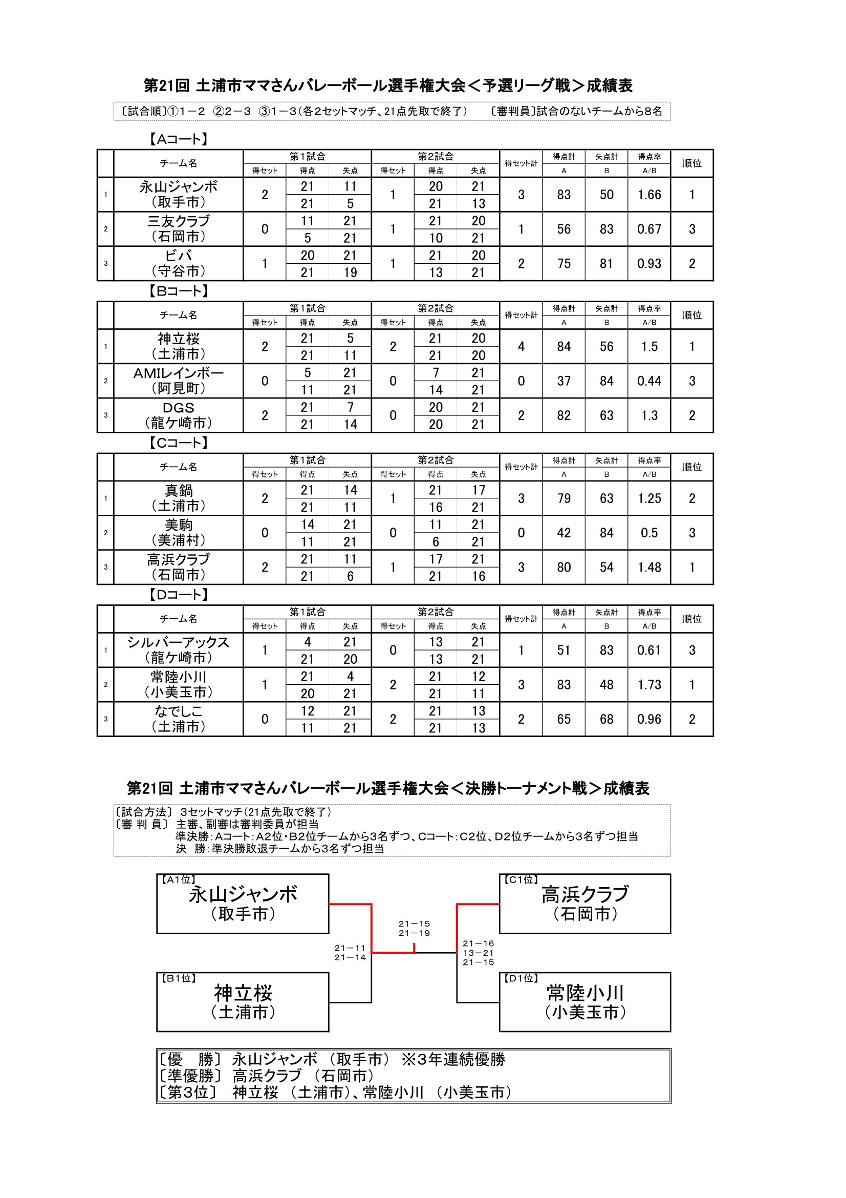第21回土浦市ママさんバレーボール選手権大会の結果